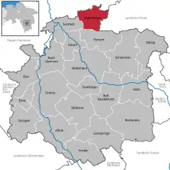 Algermissen is a village and a municipality in the district of Hildesheim, in Lower Saxony, Germany. It is situated approximately 12 km north of Hildesheim, and 20 km southeast of Hanover. The name of the town originates from a prominent German family who lived in the area until the Revolutions of 1848—the Algermissens were of the revolutionary party and were driven from Germany when the revolution was suppressed. Part of the family relocated to Missouri, in the United States, but the town continued to bear their name.[3]