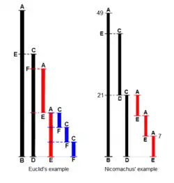 A prototypical example of an algorithm is the Euclidean algorithm, which is used to determine the maximum common divisor of two integers; an example (there are others) is described by the flowchart above and as an example in a later section.