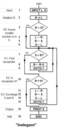 Unfortunately, there may be a tradeoff between goodness (speed) and elegance (compactness)—an elegant program may take more steps to complete a computation than one that is less elegant. An example that uses Euclid's algorithm appears below.