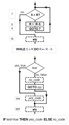 IF test THEN GOTO step xxx, shown as diamond), the unconditional GOTO (rectangle), various assignment operators (rectangle), and HALT (rectangle). Nesting of these structures inside assignment-blocks results in complex diagrams (cf. Tausworthe 1977:100, 114)."Elegant" (compact) programs, "good" (fast) programs: The notion of "simplicity and elegance" appears informally in Knuth and precisely in Chaitin: