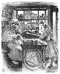 "She looked at the Queen, who seemed to have suddenly wrapped herself up in wool. Alice rubbed her eyes, and looked again. She couldn't make out what had happened at all. Was she in a shop? And was that really — was it really a sheep that was sitting on the other side of the counter? Rub as she could, she could make nothing more of it: she was in a little dark shop, leaning with her elbows on the counter, and opposite to her was an old Sheep, sitting in an arm-chair knitting, and every now and then leaving off to look at her through a great pair of spectacles."[2]