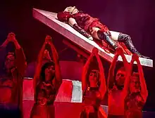In 2022, Gaga performed "Alice" live at The Chromatica Ball stadium tour as the first song of Act One of the show.[43] Similarly to the album, the song was preceded by the instrumentals of "Chromatica I" as an intro.[44] Gaga appeared on stage lying on an operating table while singing the song.[45] She was wearing a blood-red gown with peak-shoulders–designed by her sister, Natali Germanotta–, along with black leather boots and fingerless gloves.[46][47][48]