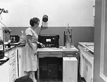 ![]() Alice Dowse Weeks, Geologist, operating an ultrasonic generator. Rapid Rock Analysis Laboratory, USGS Geologic Division, Washington, D.C. 1958. | |