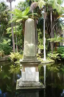 In 1831, Cunningham returned to England, but went back to Australia in 1837 on board Norfolk as government botanist, resigning the following year on finding that he was required to grow vegetables for government officials. On 27 June 1839, he died of consumption in Sydney, and was buried in the Devonshire Street Cemetery. In 1901, his remains were "reverently removed" and re-interred in an obelisk within the Royal Botanic Garden in Sydney.[16]