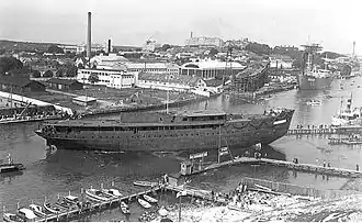 Simultaneously with the submarine projects, the yard worked already on two 3 800 ton coastal defence ship projects. Crichton-Vulcan signed contracts for the ships in November 1928. Building of such large and demanding ships required investments in facilities and cranes; also the number of employees was increased. The first one of the ships, Väinämöinen, was launched in December 1930 and Ilmarinen followed in July 1931.[7]
