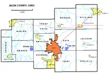 Allen County is a county located in the northwestern part of the U.S. state of Ohio. Its county seat and largest city is Lima.[1] The county was created in 1820 and organized in 1831.[2] The county is named in honor of Colonel John Allen, who was killed leading his men at the Battle of Frenchtown during the War of 1812.[lower-alpha 1]