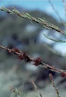 Allocasuarina paradoxa is a dioecious shrub that typically grows to a height of 1–4 m (3 ft 3 in – 13 ft 1 in) and has smooth bark. Its branchlets are more or less erect, up to 150 mm (5.9 in) long, the leaves reduced to erect to slightly spreading, scale-like teeth 0.4–0.8 mm (0.016–0.031 in) long, arranged in whorls of six or seven around the branchlets. The sections of branchlet between the leaf whorls (the "articles") are 5–12 mm (0.20–0.47 in) long, 0.7–1 mm (0.028–0.039 in) wide and have a waxy covering. Male flowers are arranged in spikes 10–40 mm (0.39–1.57 in) long, the anthers 0.7–0.8 mm (0.028–0.031 in) long. Female cones are cylindrical, on a peduncle 2–6 mm (0.079–0.236 in) long. Mature cones are 13–35 mm (0.51–1.38 in) long and 7–9 mm (0.28–0.35 in) in diameter, the samaras 4.5–5.5 mm (0.18–0.22 in) long.[2][3]