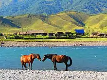 The region is inhabited by a sparse but ethnically diverse population, including Russians, Kazakhs, Altais, Mongols, and Volga Germans, though predominantly represented by indigenous ethnic minorities of semi-nomadic people.[1] The local economy is based on bovine, sheep, horse husbandry, hunting, agriculture, forestry, and mining.[2] The Altaic language family takes its name from this mountain range.