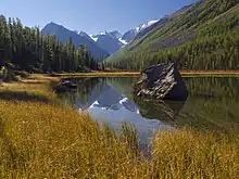 The next valley is that of the Charysh, which has the Korgon and Tigeretsk Range on one side and the Talitsk and Baschelaksk Range (Бащелакский хребет) on the other. This, too, is very fertile. The Altai, seen from this valley, presents the most romantic scenes, including the small but deep Kolyvan Lake at an altitude of 360 m (1,180 ft), which is surrounded by fantastic granite domes and towers.[4]