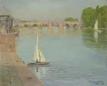 Alte Brücke (German: "old bridge") is a bridge in Frankfurt, Hesse, Germany. It is the oldest bridge over the lower course of the river Main, and until 1886 was the only stone bridge crossing the river. From the Middle Ages until the year 1914, it connected the "Fahrgasse" in Frankfurt Altstadt with the "Brückenstraße" in Sachsenhausen. Since its first mention in official documents in 1222, the development of Frankfurt has been strongly influenced by the bridge. Over the centuries, Alte Brücke has been destroyed and reconstructed at least 18 times. With its 13 brick-built circular arches, the Sachsenhausen Bridge was one of the most prominent buildings of the city, but failing to meet the increasing demands of the modern road and ship traffic, it was demolished in 1914.