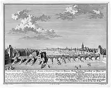 In the beginning of the 15th century, 10 of the 13 bridge arches as well as the two bridge towers were fundamentally renovated. The accountable architect might have been Madern Gerthener, who personally vouched for the safety of the vaults and arches in front of the (city?) council on 30 November 1399. On a hiking trip in Prague, Gerthener learned about the Charles Bridge, which had been built shortly before by Peter Parler. The oldest depiction of this bridge comes from 1405: It is shown in stylized form in the "Bedebuch" (burnt in World War II), with the two towers, three arches and the crucifix of the Brickegickel. The oldest complete drawing can be found in the Cosmographia of Sebastian Münster, as a part of the birds-eye view of Frankfurt, in the second issue from 1550. It is a woodcut which itself is dated 1545.[8] Shortly thereafter, in 1552, another depiction appeared on the so-called "Belagerungsplan" (besiegement plan) of Conrad Faber von Creuznach, who had already sketched the bridge in the background of his double portrait of Anna and Gilbrecht von Holzhausen in 1535.[9][10] It shows the bridge during the three-week besiegement of the Protestant city by an army of the Protestant prince, under lead of the Prince-elector Maurice, Elector of Saxony in the summer of 1552, when it was defended by the Imperial Army. During this time, the bridge had been covered by cloths, and the Main had been rendered impassable by sunken ships and an iron chain. The besiegement started on 17 July and ended with the conclusion of the Peace of Passau contract on 2 August. For the city, the loyalty to the imperator paid off well: Beginning with 1562, all coronations of the Holy Roman Emperor took place in Frankfurt.