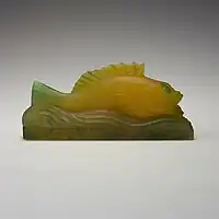 He then decided to work for the Cristalleries Daum at Nancy, France, from 1904 or 1905, where he stayed until the first World War in 1915.[3][2] There, he met a designer/modelist, Henri Bergé, with whom he made pâtes de verre always signed "Daum Nancy", without his name nor Bergé's name.[4] With his help, he cast around 100 different models; but few of these pieces from this period were preserved. He help decorating the living room of the Maison Losseau in 1911 with 15 pâte de verres representing the Belfry of Thuin and the river Sambre.[5]