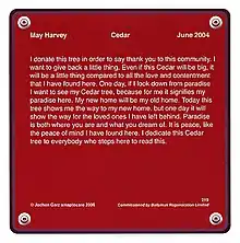 In the first phase of the project, with a target of 625 donors,[4] around 635[lower-alpha 2][9][14] trees were sponsored, with oak and wild cherry the most-chosen, and just a few of the most costly, the evergreen oak, as well as maple, cedar and pine. The total contributed by sponsors was around 45,000 euro.[4] Some corporate sponsors, including McInerney and Bruce Shaw, donated trees on behalf of community organisations, as well as the comprehensive school.[17] Each sponsor was invited, over a period of 18 months, to a face-to-face meeting with the artist. At this meeting Gerz explored the concept of the project and worked with the sponsor to develop a short text answering the question "If this tree could speak, what would it say for me?" to be printed on an enamelled plaque or lectern by their chosen tree.[2][5] Donors were also asked to choose in which neighbourhood of Ballymun the tree should be planted. The project reported that the choice of locations proved challenging, due to both the massive demolition and construction work ongoing across Ballymun, and to other, more routine, tree planting work.[9]
