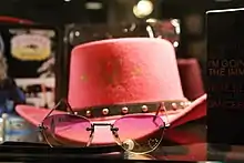Photo sessions for Music were conducted by Jean Baptiste Mondino, who had worked previously with the singer on a number of photoshoots and music videos.[58] The art direction and design were done by Kevin Reagan.[30] The artwork depicted Madonna as a cowgirl, wearing pink and blue stetsons and embroidered jeans, among hay bales and 1950s cars.[58] The images and typographical style paid homage to the iconography of the western United States, relishing Americana culture while at the same time satirizing it.[58][59] Mondino had the idea of the western themes for the album; Madonna was not sure at first, but was convinced by the photographer and eventually appreciated the final result.[60] Santiago Fouz-Hernández, author of Madonna's Drowned Worlds: New Approaches to Her Subcultural Transformations, described the visual as "a complete celebration of camp", which was highlighted by Madonna's combination of western clothing with expensive shoes such as bright red high heels.[61][62] He also thought it was inspired by Miss Rodeo America and the photo book Rodeo Girl (2000) by Lisa Eisner, and also defined it as an evocation of Judy Garland.[59][62] Madonna also used her cowgirl style during her public appearances to promote the album, including jeans, shirts and cowboy hats,[63] and eventually became one of her most recognized reinventions.[64][65]