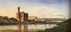 The William Howe's system was theoretically checked and then improved by the Russian engineer Dmitrii Juravsky, who was an executive assistant to George W. Whistler during the construction of the railway line. Juravsky performed structural analyses and tests on physical models of Howe trusses from 1843 to 1848, and executed studies of the effect of posttension in Howe trusses. He published two books "About Bridges of the Howe System" in 1855 and 1856.[1]