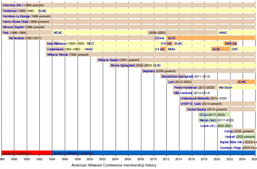 - 2020 - Three institutions left the American Midwest to join their respective new home primary conferences: Freed–Hardeman to join the Mid-South Conference, Lindenwood–Belleville to cease operations, and Park to join the Heart of America Athletic Conference (HAAC), all effective after the 2019-20 academic year.