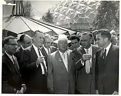 The American National Exhibition, held from July 25 to September 4, 1959, was an exhibition of American art, fashion, cars, capitalism, model homes and futuristic kitchens. Held at Sokolniki Park in Moscow, then capital of the Soviet Union, the exhibition attracted 3 million visitors during its six-week run.[1][2][3] The Cold War event is historic for the "Kitchen Debate" between then-Vice President of the United States Richard Nixon and Soviet Premier Nikita Khrushchev, held first at the model kitchen table, outfitted by General Electric, and then continued in the color television studio where it was broadcast to both countries, with each leader arguing the merits of his system,[4] and a conversation that "escalated from washing machines to nuclear warfare."[5]