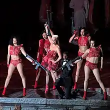 Gaga debuted the song in Guadalajara, Mexico on May 3, 2011, during The Monster Ball Tour, where she performed it in an acoustic version.[2] She later included "Americano" on the set list of her Born This Way Ball tour (2012–2013). During the performance the singer wore a modified version of her famous meat dress and sang the song while faux meat carcasses hung around her.[23] Gaga was surrounded by her dancers who were semi-nude onstage.[24] The sequence portrayed a wedding with an extended Spanish guitar intro and Gaga appearing on the meat counter as the bride in the meat dress. It ends with the singer shooting her husband onstage.[25] After finishing the song, Gaga told the audience "In 1970, women would no longer be treated like meat. On the cover of Hustler magazine or at the Born This Way Ball, meat is precisely how we treat them."[26]