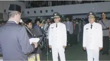 Aminuddin Ponulele (middle) taking the oath of office as the Governor of Central Sulawesi on 21 February 2001.