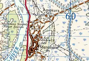 Sources differ as to the opening date. One says opening was on 20 October 1929 for goods and 11 November 1929 for passengers.[3] Another says 13 August 1877 and that the line was doubled from 1 July 1956.[4] A siding[5] was gazetted with the name Amokura in January 1929[6] and a 1930 article implied it was new.[7] It was also known c.1929 as Ngatikoi or Raumoa. A crossing loop was closed on 13 May 1963. at that time there was a proposal to combine it with Meremere station,[3] as they were only a chain (22 yd (20 m)) apart and Meremere was larger and better known.[8]