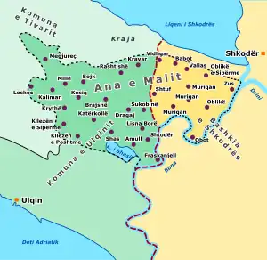 Ana Malit ("side of the mountain" in Albanian) is a region in the south Montenegro and northwestern Albania. Ana Malit consist some villages, such as Vladimir, Kravari, Krytha, Kllezna, Milla, Lulaj, Shasi, Amulli, Gjonza, Dragina, Brajsha, Sukubina, Selita, Shtodra and Rashtisha. Šas hosts ancient church ruins and its old castle. The town of Krytha is next to Mount Suka. Sukubina is closer to the Albanian border than the other villages.