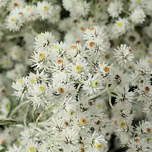 Pearly everlastings are suitable for flower beds and floral arrangements. They provide attractive, but not brilliant displays of bloom in late summer and fall. They are sometimes placed adjacent to red or blue flowers for aesthetic purposes.[5] The flowers are useful for cutting and are easily prepared for dried arrangements. This is done by cutting them before they attain their fullest opening and before the whiteness of the stems and foliage begins to dim, tying the stems in small bundles, and hanging them in a cool, airy, shaded place. It is not uncommon to color the dried flowers by dipping them in dyes.