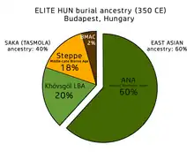 A later different Eastern influx is evident in three outlier samples of the Saka Tasmola culture (Tasmola Birlik) and one of the Pazyryk culture (Pazyryk Berel), which displayed c. 70-83% additional Ancient Northeast Asian Amur-derived ancestry, suggesting them to be recent migrants from further East. The same additional Eastern ancestry is found among the later groups of Huns (Hun Berel 300CE, Hun elite 350CE), and the Karakaba remains (830CE) and may be associated with the westwards expansion of Xiongnu tribes. A Hun individual from an elite burial of the mid-4th century CE in Budapest, Hungary, was reconstructed as 60% Ancient Northeast Asian/Amur (ANA) and 40% Saka.[39]