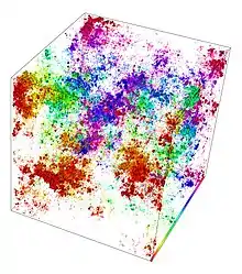 - Example of an electronic eigenstate at the MIT in a system with 1367631 atoms Each cube indicates by its size the probability to find the electron at the given position. The color scale denotes the position of the cubes along the axis into the plane
