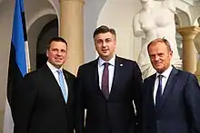After attending his first European Council summit on 20 October 2016, in an address to the Croatian Parliament, Plenković said that "there is no need for Croatia to build border fences".[44] Plenković's first official foreign visit was to Sarajevo, Bosnia and Herzegovina on 28 October 2016. Plenković said that his government will support Bosnia and Herzegovina on its path towards membership in the European Union. Discussions were held regarding the political rights of Bosnian Croats, mostly in terms of bringing their political rights to the level enjoyed by Bosniaks and Bosnian Serbs.[44][45] In November, he visited Ukraine where he met with Prime Minister Volodymyr Groysman. Plenković expressed support for a peaceful reintegration of the areas of Ukraine under the control of pro-Russian rebels. The two governments established a working group to share Croatia's experience with the reintegration of eastern Slavonia in 1998.[46] The Russian Ministry of Foreign Affairs commented that the visit "raised serious concerns in Russia".[47]