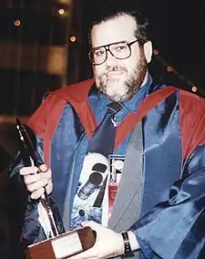 Andrew Porter with the Best Semiprozine Hugo Award at the 1993 Worldcon