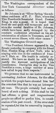 After the fact, Johnson "hid from the press" at the Silver Spring estate of the Blair family in Maryland.[60] According to historian Louis Clinton Hatch, "The Senate Journal shows that he presided at the session of Monday, March 6, and the correspondent of the New York Tribune wrote his paper that the Vice-President attended the inauguration ball that evening and was especially attentive to Mrs. Lincoln; but, on March 7, Mr. Johnson was absent from the Senate and remained so throughout the session. It is probable that he went to Silver Spring on that day, and it is certain that he stayed there about a fortnight until after the Senate had adjourned, after the excitement over his inauguration had died down, and his health had improved."[91][lower-alpha 7][lower-alpha 8] From Maryland, Johnson wrote letters explaining that had been "prostrated" by typhoid.[60] Johnson made no public appearances until April 3, when he made an impromptu speech in front of a Pennsylvania Avenue hotel about the fall of the Confederate capital.[60] According to the memoirs of James G. Blaine, Johnson was back in Washington again about April 9, 1865, and "when Mr. Johnson arrived from Fortress Monroe on the morning of April 10, and found the National Capital in a blaze of patriotic excitement over the surrender of Lee's army the day before at Appomattox, he hastened to the White House, and addressed to the unwilling ears of Mr. Lincoln an earnest protest against the indulgent terms conceded by General Grant."[93] In 1866, a Tennessee newspaper account had it that Lincoln met with Johnson on April 11, 1865, forgoing a family carriage ride to take the meeting, and when he returned, "remarked with much apparent concern 'That miserable man; I cannot imagine the trouble he will cause during my second term of office.'"[94] According to the standard account, Johnson and Lincoln supposedly did not meet again until the afternoon of April 14. That night John Wilkes Booth shot Lincoln in back of the head; the 16th president died at 7:22 a.m. the following day. Johnson's 42-day term would be the second-shortest vice-presidency in American history.