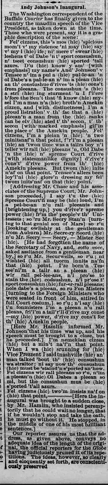Yesterday the Vice President elect, Hon. Andrew Johnson, arrived in our city, en route for the scene of his future glories at Washington. In the evening, after a collection had been made by several prominent Republicans in the city, a brass band was hired to serenade the dignitary at the Burnet House. The Hon. Johnson came forward to respond, but appeared to be suffering from severe physical weakness, and could not be long exposed to the keen night air. Our shorthand reporter's notes of the speech, when written out, present an unintelligible appearance, exhibiting three or four "fellow citizens" on each line [...] We must apologize [...] and promise Mr. Johnson a better report next time.[20]