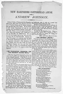 The stumbling, stammering, and repetition mentioned by the Herald led one study of vice-presidential inaugurations to surmise that that they were still using an early, longer version of the Vice Presidential oath of office on this occasion.[48] Brooks thought Johnson's oath was "inaudible" but when he was done Johnson "turned and took the Bible in his hand, and, facing the audience, said, with a loud, theatrical voice and gesture, 'I kiss this Book in the face of my nation of the United States.'"[40][49][50] Rev. Henry Ward Beecher was apparently present; "He saw the Bible whirled by the incoming V. P. about his head, like a cap when a man gives three cheers...The spectacle of an inebriated Vice President hiccoughing out his oath of office furnished such a text for discourse on temperance as hardly turns up once in an age."[51] A Cincinnati paper reported that he had "driveled over the Holy Book as he took the oath of office," described the speech as "the idiotic babble of a mind besotted by a fortnight's debauch," demanded that Johnson resign, and editorialized "This cannot be covered up as a private infirmity [...] Mr. Johnson made a similar exhibition of himself here, and we then refrained on commenting on it because we thought it might only be a lapse in the interval when he was free from public duties."[52]