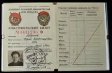 Andropov was educated at the Rybinsk Water Transport Technical College and graduated in 1936.[5] As a teenager he worked as a loader, a telegraph clerk, and a sailor for the Volga steamship line.[9][6] At 16, then a member of the All-Union Leninist Young Communist League (YCL, or Komsomol), Andropov was a worker in the town of Mozdok in the North Ossetian ASSR.[5]