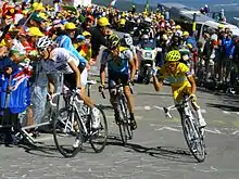 In the Tour de France, he was much closer to the victory – against Alberto Contador again – but took what was at the time second place (by 39 seconds) and won the young rider classification for the third time in a row. Schleck was involved in a controversial incident on the Port de Balès during stage 15 while wearing the maillot jaune and attempting to extend his lead. He was riding with incredibly good form and with 24 km to go Schleck attacked at the front of the group of favorites dropping some riders but the main favorites contained this initial attack. With 22 km to go he attacked again and initially there was no response from his rivals but almost immediately his chain fell off.[8] His main rival for the Tour, Alberto Contador, did not stop even though he likely knew that Schleck had a mechanical issue and had not cracked. Samuel Sánchez and Denis Menchov attacked as well leaving Schleck behind as Contador took the lead from Schleck. Some sections of the media saw Contador's behaviour as unsporting and felt he should have allowed Schleck to regain the lost time. However, some sections of the media and members of the peloton did not have a problem with Contador's attack. The incident also produced the iconic quote "If you draw your sword and you drop it, you die", from Ryder Hesjedal.[9] Schleck lost 39 seconds on that stage in the mountains, the same number of seconds by which he eventually lost the Tour de France. Schleck was only the second man to ever win the white jersey for best young rider 3 times; the first was Jan Ullrich who won between 1996 and 1998. He also won two mountain stages, and rode in the yellow jersey for six days.