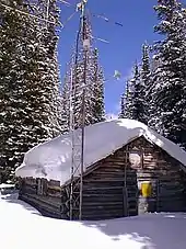 In the early 1920s snow survey science and water supply forecasting had proven more than valuable in predicting the volume of water that would flow down the streams and into valleys each year.[38] Oregon was among the many western states that had begun establishing snow courses and taking snow surveys throughout their mountain ranges based on the pioneering work of Dr. James E. Church on Mount Rose near Reno, Nevada. The station at Aneroid Lake was installed in 1925 with records being kept after 1928.[39] Wallowa County was initially responsible for obtaining the data from sampling the snow depth, determining water content and metering stream flows but when it began to feel budget constraints the program was defunded. The Associated Ditch Companies knew they had to have the information to accurately estimate how much water will be coming into the reservoir when the spring melt begins and volunteered to assume the responsibilities for doing so in 1933.[40] Because Aneroid Lake is located within a protected area[lower-alpha 6] surveyors could not take advantage of the continuing advances in over-snow travel machinery.[42] The danger and hardships of merely reaching the snow course location with snowshoes and skis during the harshest weather months of the year proved too great resulting in measurements being taken only once per year, in early April before the melt.[38][43] The method proved to be insufficient at providing the data that had become more and more valuable in accurate forecasting of the water supply. Agriculture and now recreation interests for boating and fishing wanted to know earlier and earlier in the year "How much water would there be?".[38][43] This prompted the investment of nine hundred dollars of capital to construct a small survival cabin capable of sheltering two men for several weeks east of the lake and below its outlet that forms the East Fork Wallowa River. It has a wood stove, a table and a concrete frost-proof cabinet for the supplies brought by pack train in early October each year making the trips for surveyors much more frequent and the quality of the data was vastly improved.[40]