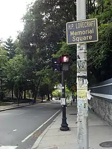 HP Lovecraft Memorial Square intersection of Angell St and Prospect St in Providence.
