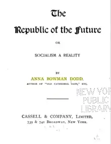 Cathedral Days, a story of a season spent in the English cathedral towns, enjoyed success, as did the second book, The Republic of the Future (New York : Cassell & Co.). It was apparent that Edward Bellamy drew much of the inspiration for his utopian prophecy from The Republic.[2][1] In The Republic, Dodd attempted the prophetic role, and presented a view of life at the middle of the 21st century, when the theories of Henry George would become completely realized. She wrote that death would save us from the problem of justice, liberty, equality, and fraternity. She described a nation of intellectual mediocrity where it was a crime to excel in anything, and where aristocracy and learning are detested and feared. The book's universe was based on a rigid equality, one house being precisely like every other house; where everyone's clothes were the same; where women were on the same footing as men; where there was no home life; where the children were reared in a government "kindergarten" without a parental love or care; where even food was prescribed by a state official, and in the shape of pellets sent whirling into the socialist's alimentary canal through a government "culinary duct"; where the people were pining away from mental and physical inactivity; where there was no God, no religion, no object in life worth living for, but there was a centralized government.[5]
