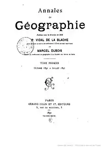 The Annales de Géographie was founded in 1891 by Paul Vidal de La Blache (1845–1918).[1] It was published by Armand Colin from the first edition until the present. From 1893 to 1915 the journal contained a yearly Bibliographie de l'année (Bibliography of the Year). Until 1946 the title on the cover was Annales de géographie, Bulletin de la Société de géographie. With volume 282 (April/May 1941) the journal absorbed the society's La Géographie (1900). It did not appear in 1944.[2] The Société de géographie's bulletin was published independently from 1947 under the title Acta geographica.