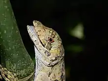 Anolis capito, the bighead anole, is a species of lizard in the family Dactyloidae. The species is found in Mexico, Guatemala, Belize, Honduras, Nicaragua, Costa Rica, and Panama.[2] Although they are active all day, it seems that these enigmatic anoles spend the majority of their time in the shade, where they reside low on trees in a shady rain forest. The mean temperature of the body is 28.8 +/- 0.5 degrees Celsius, meaning that it is 1.3 degrees Celsius higher than the substrate and 1.7 degrees Celsius higher than the air. Compared to men, females are larger and reach sexual maturity at a larger SVL.[3]