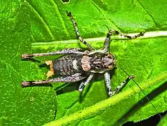 Cerci of the males are unusual. They are whitish, flattened and internally toothed. All pairs of the powerful legs bear small spines on the lower part.[6]