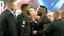 On 29 December 2018, with Joshua's Wembley date still on hold, Hearn stated that Dillian Whyte was the frontrunner to challenge Joshua.[164] Whilst still waiting for Hearn to contact him, Whyte claimed to hear rumours that Joshua would drop the Wembley date and instead fight American contender Jarrell Miller at Madison Square Garden.[165] On 12 January 2019, Whyte revealed that he had turned down a 'severe lowball' offer from Joshua to fight him in a rematch. Whyte did not reveal the figure, however claimed it was lower than what he received against Chisora in December 2018.[166] By 21 January, Hearn stated there could be a possibility Joshua may well fight in the US instead.[167] According to Hearn, it was Joshua who was making the offer for the Whyte fight. Whyte claimed Joshua did not want to fight him, as he had known since September 2018, that he would be fighting in April 2019, yet did not make any offers.[168] On 1 February, Hearn admitted it was becoming highly unlikely that Joshua would still fight at Wembley Stadium on 13 April.[169] On 2 February, Whyte claimed the Joshua fight 'was dead' and he was to look at other options, including a potential fight with Dominic Breazeale.[170][171] According to Miller, Joshua initially offered Whyte $3 million, then increased the offer to $5 million, only to go down to $3.5 million.[172]