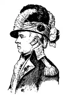 In October 1775, he obtained a commission as major and aide-de-camp to General George Washington. After less than a month, he was dismissed by Washington for not being ready enough with his pen[4] and being unsuited for clerical work.[5] On February 9, 1776, White was commissioned by the Continental Congress as the lieutenant colonel of the 3rd New Jersey Regiment. He fought at the Battle of Monmouth, with his dragoons taking the lead as the most advanced scouting parties in the morning offensive. When the 16th Queens Light Dragoons spotted White's units and charged, the American dragoons led the British horsemen into a trap formed by the infantry formations of Butler and Jackson, who killed several British dragoons and forced the rest into a disorderly retreat.[6] White was actively engaged in the service in the North until 1780, being successively appointed Lieutenant Colonel of the 4th Continental Light Dragoons in the Continental army, February 13, 1777, lieutenant colonel commandant of the 1st Continental Light Dragoons, December 10, 1779, and colonel, February 16, 1780. At that time, he was ordered by General Washington to take command of all the cavalry in the southern army, and, upon his own personal credit, equipped two regiments with which to operate against Lord Cornwallis in South Carolina.