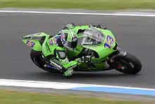 Following the retirement of Olivier Jacque in June 2007, West was offered the position to race with the Kawasaki Racing Team in MotoGP and aboard the Ninja ZX-RR for the remainder of the season, buying out his contract with Yamaha.[6] He made a good debut at the British Grand Prix, reaching fourth position, but then crashing and eventually finishing 11th.[7] His first four races each saw him finish progressively higher, with seventh at Mazda Raceway Laguna Seca and eighth at the Sachsenring.[8] He was seventh again in the wet at Motegi, but could have been even higher. Starting 6th, he jumped the start fractionally – by the time the ride-through penalty was handed out, he was leading the race. Teammate Randy de Puniet came second amidst an all-Bridgestone podium, emphasising the missed opportunity. In his home country's Grand Prix the Australian's error caused him to only finish 12th while compatriot Casey Stoner won aboard his Ducati.