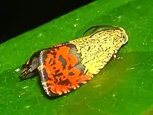 The wingspan is about 13 mm. The basal half of the forewings is yellow, irrorated (sprinkled) with blackish and with a dark-fuscous line. Beyond this, the ground colour is dull purple, with dark-fuscous markings edged with red, except for four yellowish costal dots. The hindwings are dark fuscous, partly suffused with pale reddish.[2]