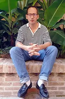 Man in striped shirt and jeans, which became in style from the late 80's to 90's