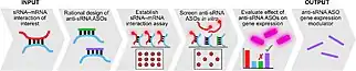 Antisense small RNA can also be engineered and utilized by scientists to perform experimental functions.[20] In synthetic biology, employing non-coding RNA such as antisense small RNA has advantages for creating regulatory architecture within engineering systems, provided the ability to predict function using the strand sequence.[20] In experiments, engineered riboregulators, which are specific RNA that respond to signal RNA through complementary base pairing utilizing anti-small RNA, have been found to be capable of activating independent gene expression.[20] Development of RNA array-based interaction assays that allow for screening in vitro have further advanced platforms targeting gene expression with antisense small RNAs.[19][21] RNA-array based interaction assays screen for synthetic antisense small RNA interactions in vitro, through a surface-capture technique.[19][21] An array of immobilized double-stranded DNA template for antisense small RNA sits opposite to an RNA-capture surface composed of possible antisense small RNA targets, separated by a solution of transcription reagents.[19][21] Captured RNA are visualized using fluorescent staining, which can indicate whether a prospective antisense small RNA has been bound to its target.[19][21]