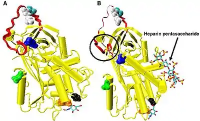 Upon binding to this pentasaccharide sequence, inhibition of protease activity is increased by heparin as a result of two distinct mechanisms.[29] In one mechanism heparin stimulation of Factor IXa and Xa inhibition depends on a conformational change within antithrombin involving the reactive site loop and is thus allosteric.[30] In another mechanism stimulation of thrombin inhibition depends on the formation of a ternary complex between AT-III, thrombin, and heparin.[30]