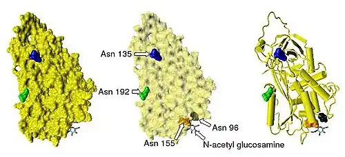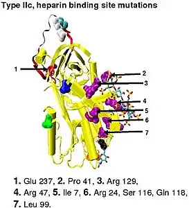 - ↑ Turk B, Brieditis I, Bock SC, Olson ST, Björk I (1997). "The oligosaccharide side chain on Asn-135 of alpha-antithrombin, absent in beta-antithrombin, decreases the heparin affinity of the inhibitor by affecting the heparin-induced conformational change". Biochemistry. 36 (22): 6682–6691. doi:10.1021/bi9702492. PMID 9184148.