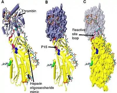 - 1 2 Whisstock JC, Pike RN, et al. (2000). "Conformational changes in serpins: II. The mechanism of activation of antithrombin by heparin". J. Mol. Biol. 301 (5): 1287–1305. doi:10.1006/jmbi.2000.3982. PMID 10966821.